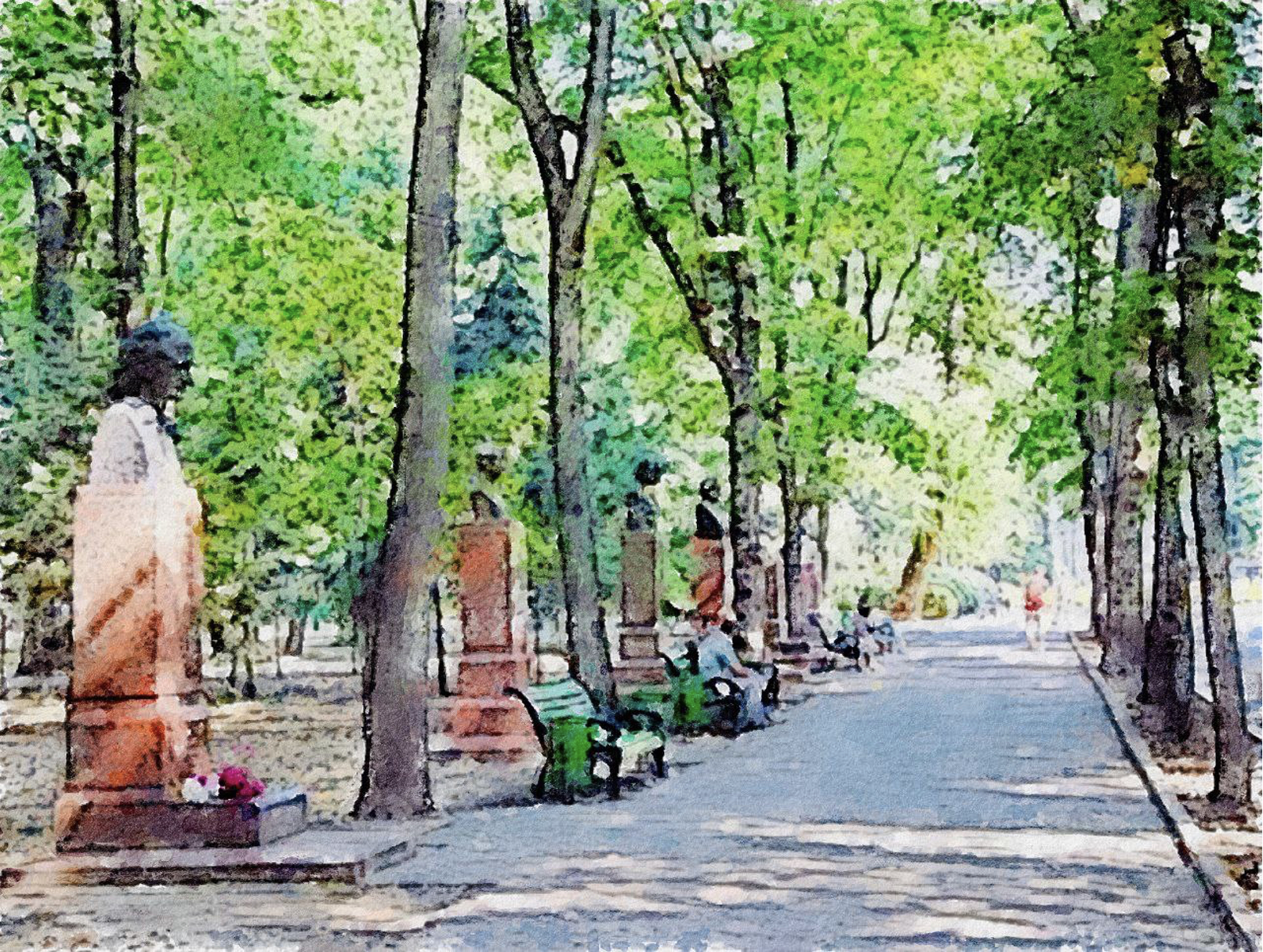 · По обе стороны аллеи на постаментах из красного полированного гранита установлены бронзовые бюсты писателей и общественно-политических и культурных деятелей Молдавии.
