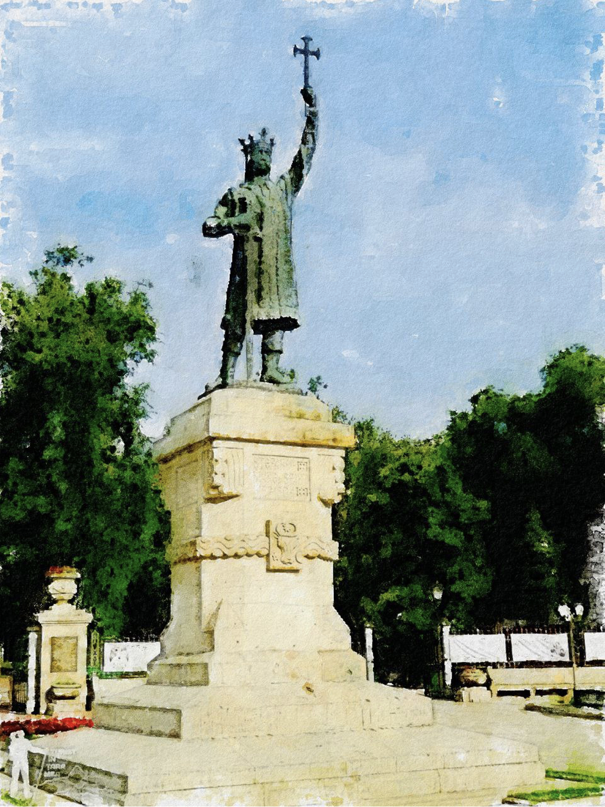 История создания: в 1923 году скульптору Александру Плэмэдялэ было предложено разработать проект памятника. За основу для работы над портретом скульптор взял миниатюру, датированную 1475 годом, найденную им в Хуморском монастыре (на территории современной Румынии).